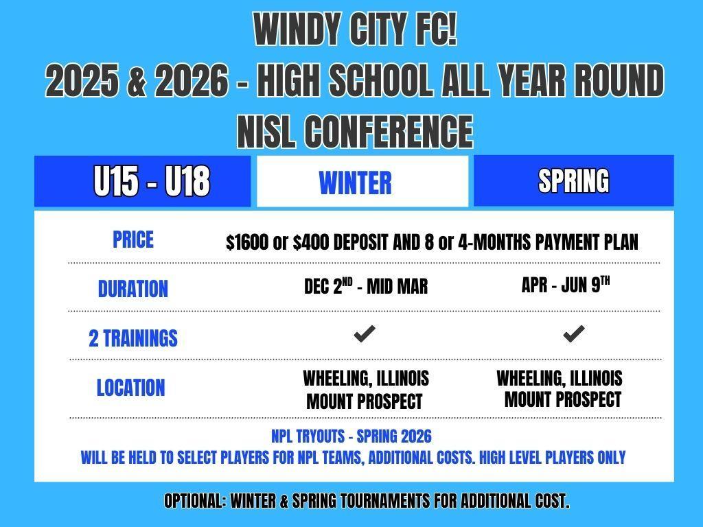 HS U17/U18 - NISL Conference & NPL (NPL IS BY INVITE/SELECTION AND WILL HAVE ADDITIONAL COSTS, COSTS WILL BE DISCUSSED WITH FAMILIES OF SELECTED PLAYERS)